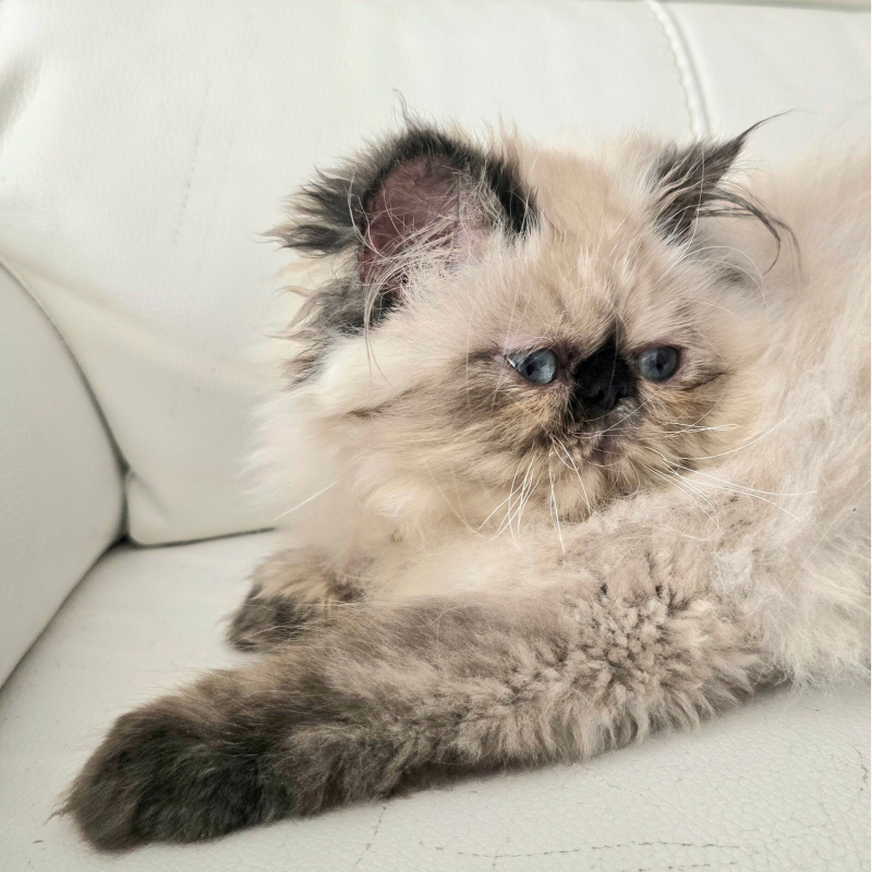 Himalayans always have blue eyes and a pointed coat pattern — meaning their face, ears, tail, and paws are darker than the rest of the body. Common colours include Seal Point, Blue Point, Flame Point, and Lynx Point.